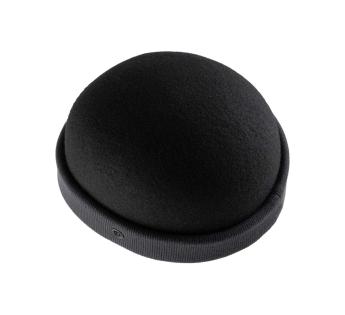 Small hat without brim in molded felt. Clean lines. Minimalist and assertive style. Its reimagined shape sculpts the face with character, perfect for mid-season. Two materials meet: a felt with impeccable structure and a ribbed cotton brim in a deep, almost black, navy shade.