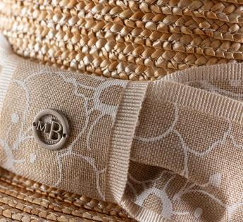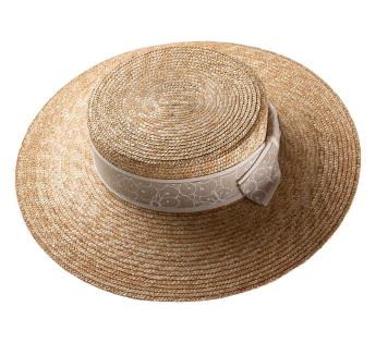 This Boater Hat in straw enchants with its elegant silhouette and luminous natural hue. Its braid, screen-printed with a refined floral motif and accented by a matching grosgrain ribbon, delicately highlights the crown, while the bow at the back lends a touch of sophistication.