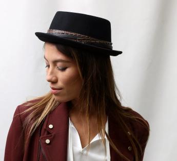 Porkpie hat made of leather and featuring a plait which envelops the design. The orignal creation also holds a black metal cap for more brilliance and sophistication. This winter, plus being warmly covered, we'll be enjoying the nice comfort of the leather and of the plaiting.