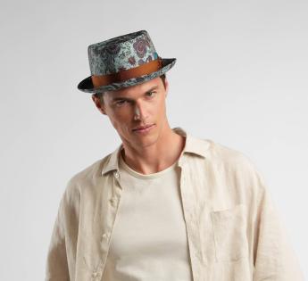 Porkpie hat design from a fabric of baroque patterns. The print on its round crown matches the underside of the brim. The design is finished by a two-tone knot.