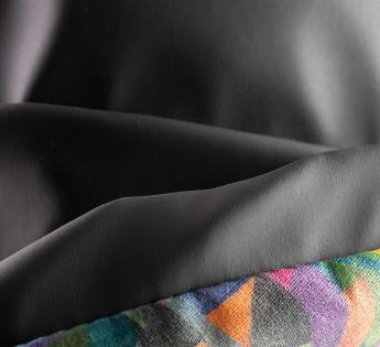 Elegant and modern bucket hat made from waterproof coated taffeta fabric. The underside of the brim is colored with geometric shapes, beautifully playing with contrasts.
