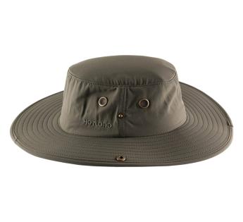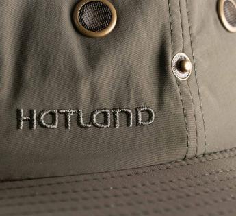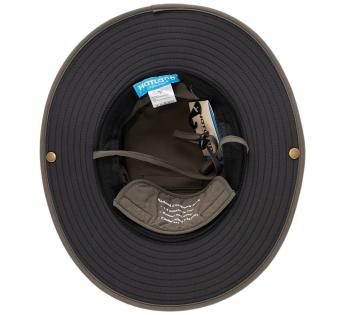 Wide brim. front and back 8 cm, sides 7 cm, can be turned up with snap buttons.