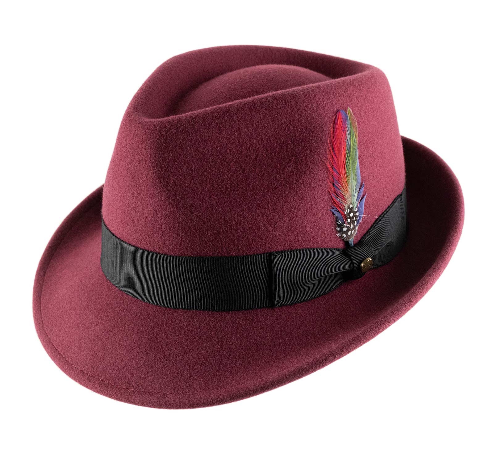 The classic trilby is charming and timeless. The flat top, surrounded by a wide brim, lends it a hint of sportiness. Deep pleats give the design an exciting edge.