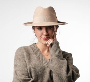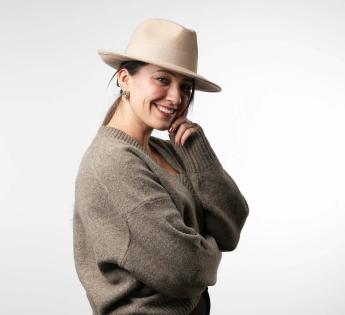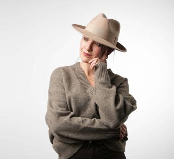 This hat enjoys a timeless elegance through a 100% wool felt. It is adorned with a tone-on-tone grosgrain band. Its cut will suit all morphologies for a very stylish covering, capable to easily sublimate our compositions. Its crown is center dent and then pinched on both sides on the front to allow an easy seizure.