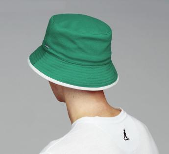 Reversible bucket hat of a polo inspiration and with a tag to remove delicately. On one side, we have a green pique fabric, whereas the other features a white ripstop nylon. The result is a strong, really helpful and elegant accessory, easy to wear.