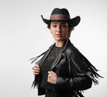 Western hat with a bohemian style, crafted in our workshop in Lyon. Made from Italian wool felt, warm and naturally water resistant, it stands out with its wide, latte-colored brim that can be adjusted according to the desired look. An artisanal creation designed to face winter with elegance and character.