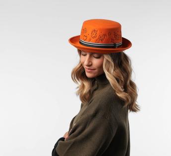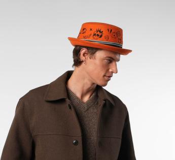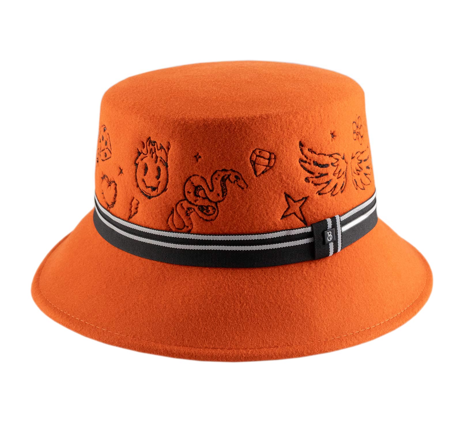 Colorful, bold, and ultra-creative, this wool felt Bucket hat reinvents the codes of headwear. Its flat crown is entirely embroidered with graphic tattoo-like patterns, adding a street and quirky touch. The striped braid structures the ensemble, enhanced by a metallic Label at the center. This model attracts all eyes while asserting true freedom of style.