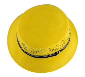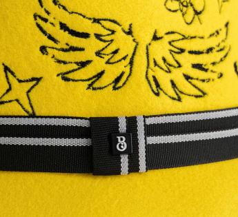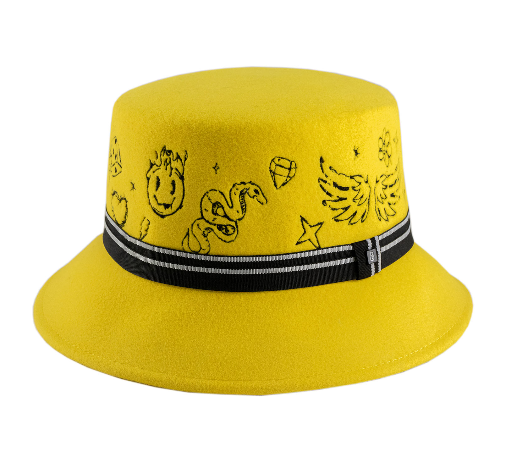 Colorful, bold, and ultra-creative, this wool felt Bucket hat reinvents the codes of headwear. Its flat crown is entirely embroidered with graphic tattoo-like patterns, adding a street and quirky touch. The striped braid structures the ensemble, enhanced by a metallic Label at the center. This model attracts all eyes while asserting true freedom of style.