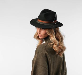 The ensemble is highlighted by a double contrasting braid combining raw suede leather and satin ribbon. This play of textures, between roughness and softness, accentuates the singular allure of this hat with a strong character.