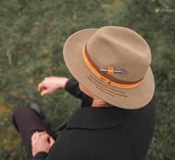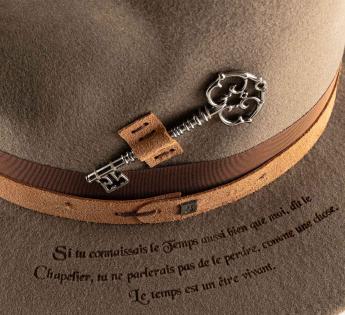 Entirely crafted from dense and structured wool felt, this model revisits the classic Outback Hat shape through a symbolic aesthetic inspired by the poetic universe of Lewis Carroll. An ancient key, fixed in place of the traditional feather, becomes the emblem of the mystery of time, a direct nod to the Mad Hatter from Alice.