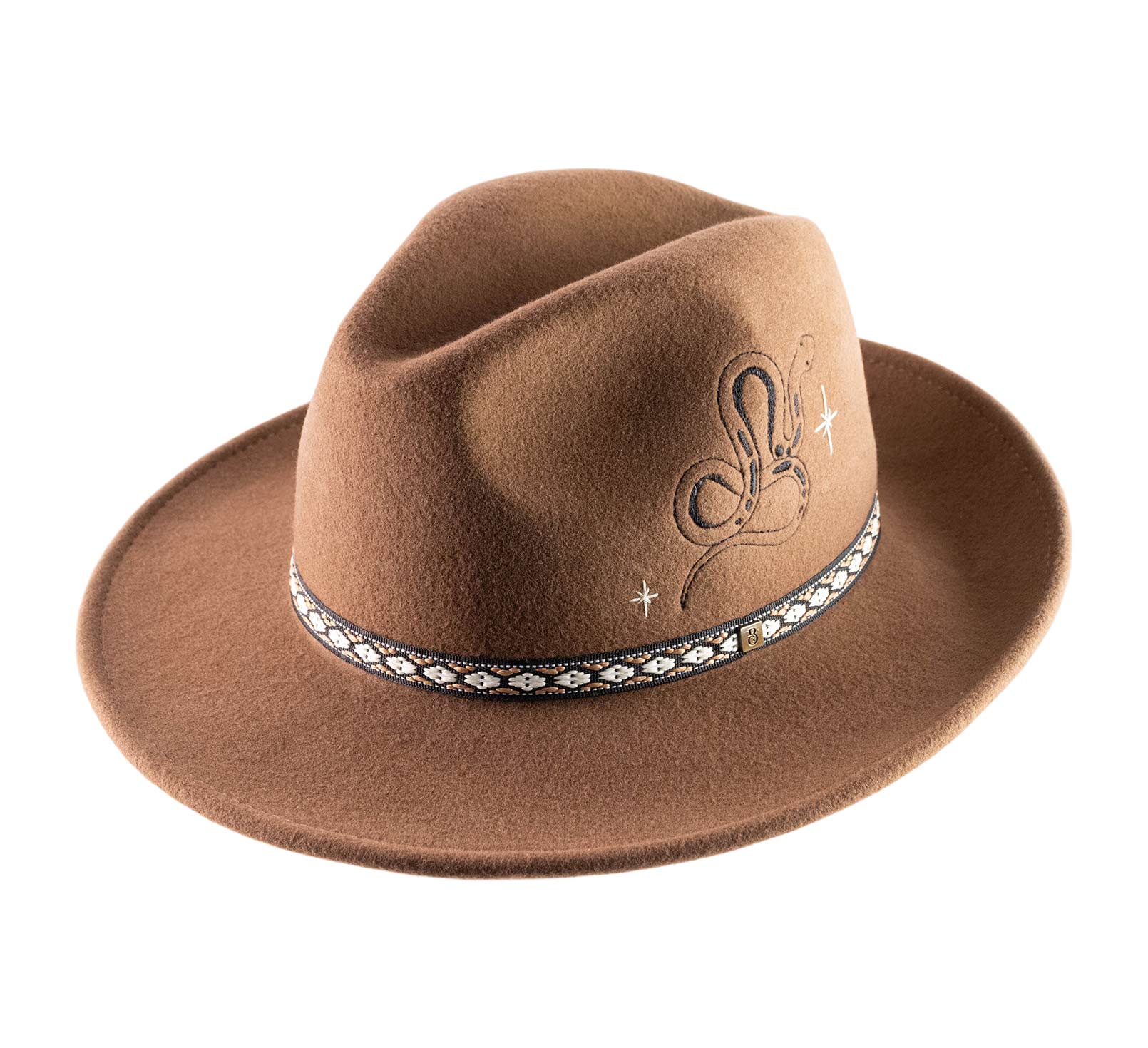 Fedora-shaped hat personalized with tattoo-style embroidery. The embroidery wraps around the crown, which is also adorned with a fine band featuring matching geometric patterns.