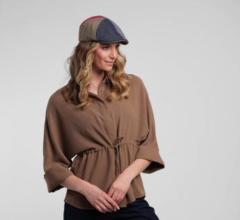 Flat cap crafted with a play of colors and textures, featuring an asymmetrical shape that adds a touch of modernity. Its patchwork design reveals a harmonious and refined contrast, making this cap a unique piece. The finishes are also meticulously executed.