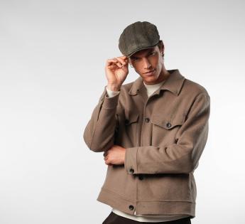 Waxed cotton flat cap. It gives the illusion of aged, patinated leather. Made from a technical fabric that combines the breathability of cotton with the durability of synthetic fibers, its warm color and soft texture give it a timeless character, perfect for those seeking an authentic yet refined style. The discreet metal emblem on the side emphasizes the quality and attention to detail.