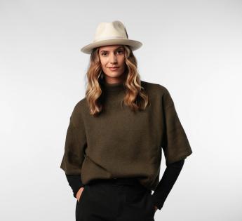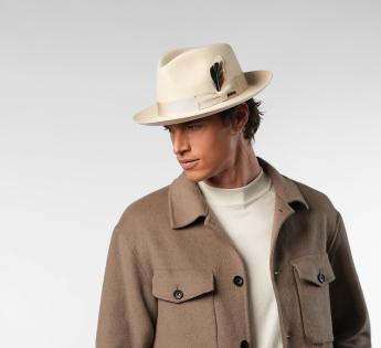 The mid-length brim, fully turned up, gives this Fedora Hat a soft and very modern line. Its sleek design gains character thanks to a natural feather subtly tucked into the grosgrain braid.
