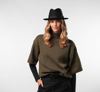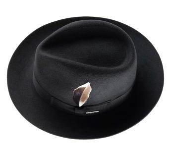 The mid-length brim, fully turned up, gives this Fedora Hat a soft and very modern line. Its sleek design gains character thanks to a natural feather subtly tucked into the grosgrain braid.