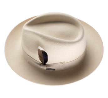 The mid-length brim, fully turned up, gives this Fedora Hat a soft and very modern line. Its sleek design gains character thanks to a natural feather subtly tucked into the grosgrain braid.