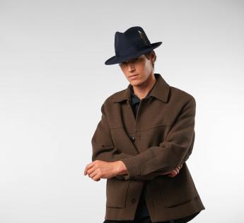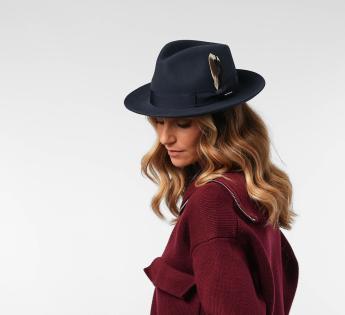 The mid-length brim, fully turned up, gives this Fedora Hat a soft and very modern line. Its sleek design gains character thanks to a natural feather subtly tucked into the grosgrain braid.