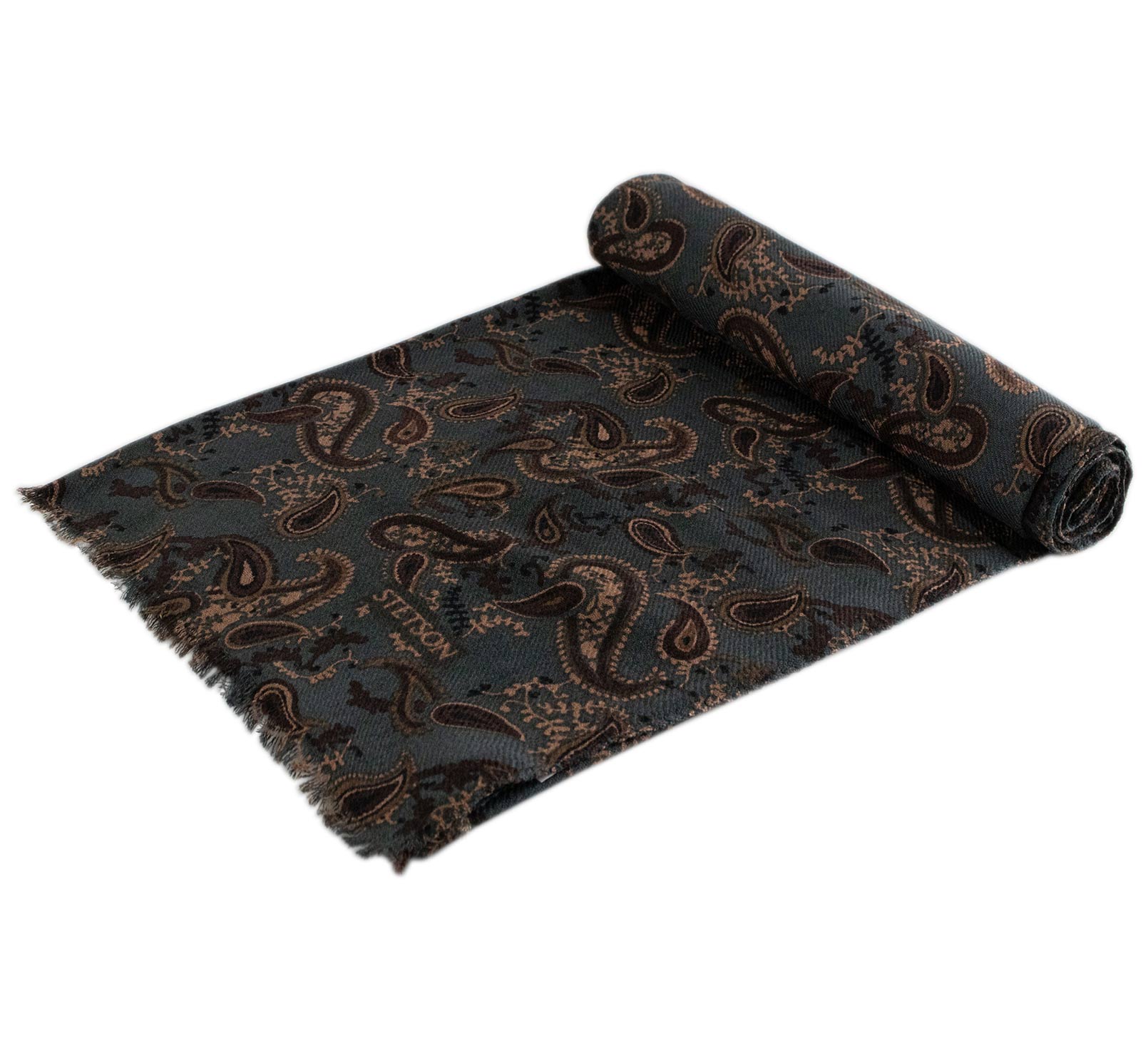 Warm and full of character, this pure wool scarf stands out with its timeless paisley pattern in deep, elegant hues. The natural material ensures an enveloping, breathable, and insulating comfort, perfect for cooler seasons.