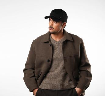 Its felted, soft, and cozy appearance gently catches the light, revealing subtle reflections. This elegant texture also enhances the naturally water-repellent properties of cashmere, ensuring a serene wear every day.