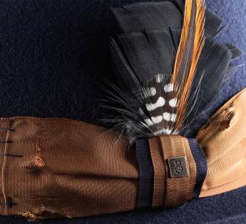 Its satin braid has been carefully burned, frayed, and scratched to create a unique aged effect, reinforced by embroideries to hold the knot. A natural feather highlights this contrast between elegance and nonchalance. On the crown, openwork embroidered cutouts add depth and originality to the ensemble.