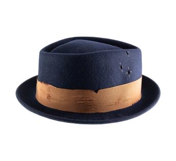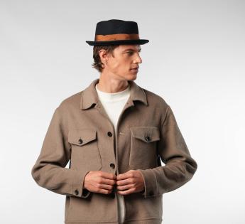 This porkpie reinterprets the codes of the classic with a touch of boldness. Crafted from a beautifully dense wool felt, it reveals a deliberately patinated look, almost cinematic.