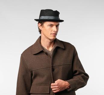 This porkpie reinterprets the codes of the classic with a touch of boldness. Crafted from a beautifully dense wool felt, it reveals a deliberately patinated look, almost cinematic.