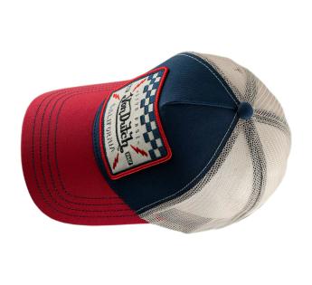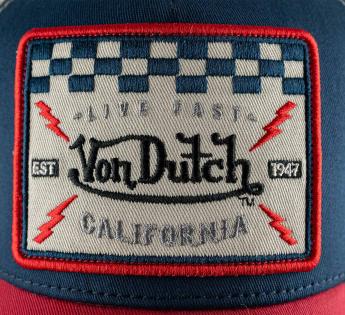 Embroidered Von Dutch patch, large rectangular badge with racing graphics, enhanced by a highly visual red outline.